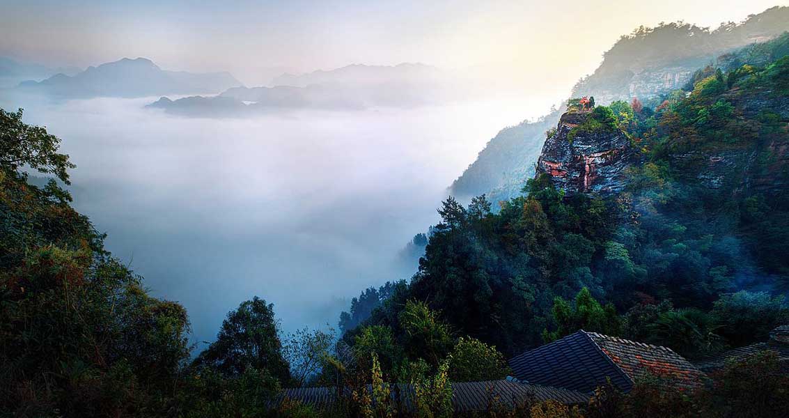 齊云山由中生代晚白堊紀的陸相紅色巖系組成。它們堆積在斷陷盆地中,巖性強弱相間,巖層傾角不大,富有垂直節(jié)理。由于地處北亞熱帶氣候環(huán)境,高溫多雨,直接出露地面的紅巖,在風化和流水割切與散流沖蝕作用下,形成了“丹霞地貌”。